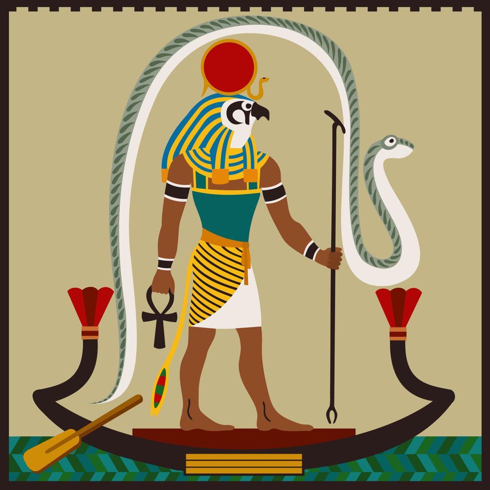 Rá era uma das divindades mais importantes da mitologia egípcia, sendo o deus do Sol e considerado o criador do universo. Ele era frequentemente representado como um homem com a cabeça de um falcão e um disco solar sobre ela. Durante o dia, Rá navegava pelo céu em sua barca solar, iluminando o mundo. À noite, ele fazia uma perigosa travessia pelo submundo, enfrentando a serpente do caos, Apófis. Essa jornada simbolizava o ciclo eterno de morte e renascimento.